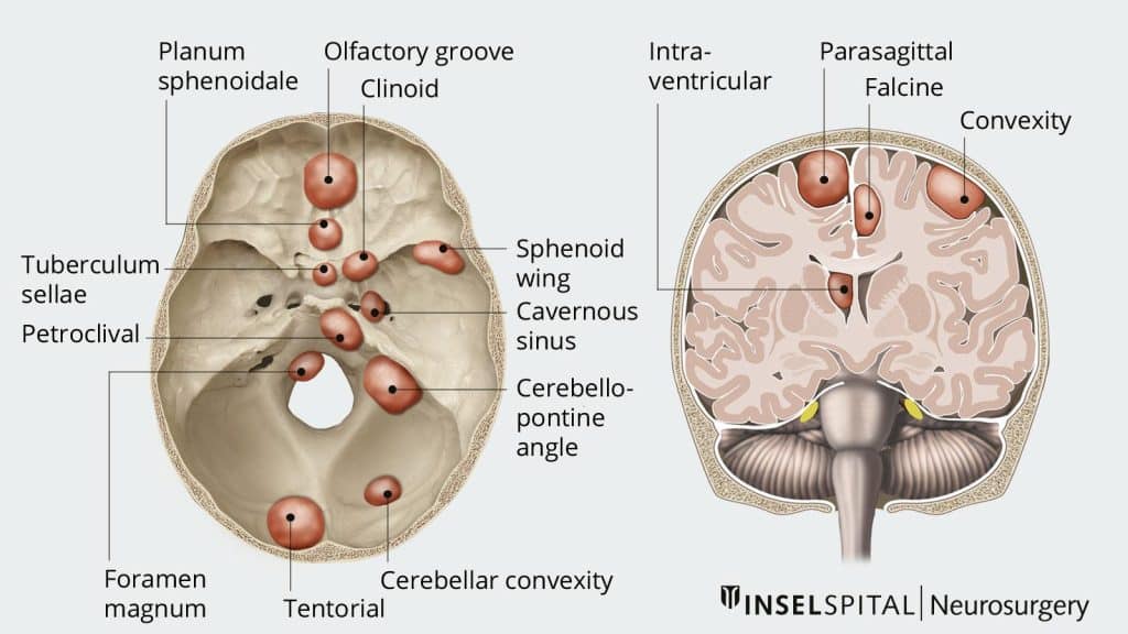 Os meningiomas nascem das meninges cerebrais, e podem ocorrer em qualquer lugar onde haja meninge. Sua nomenclatura (classificação) depende da região onde esse tumor nasce, e sua dificuldade de tratamento cirúrgico advém em grande parte da localização e também de seu tamanho e dureza. A despeito de ser um tumor benigno, a cirurgia pode ser bastante desafiadora.