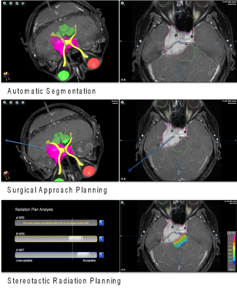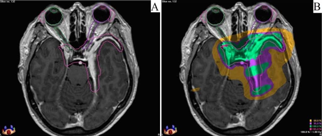 Plano de tratamento radiocirúrgico para um meningioma da base do crânio, onde poupa-se as vias visuais e o tronco encefálico de doses excessivas de radiação.