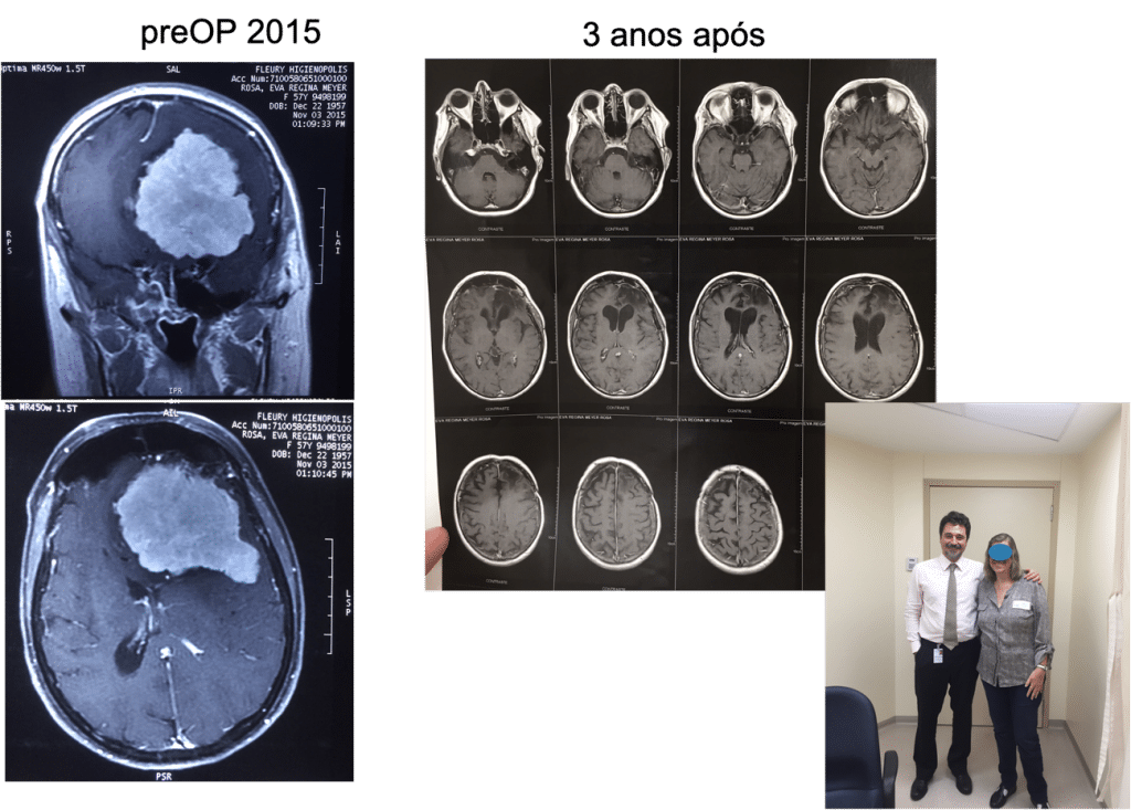 Um volumoso meningioma de base de crânio (imagem branca à esquerda demonstrada na ressonância magnética), o resultado da cirurgia mostrando retirada completa da lesão na imagem do meio e a fotografia da paciente totalmente recuperada (lado direito), vivendo normalmente e sem sintomas.